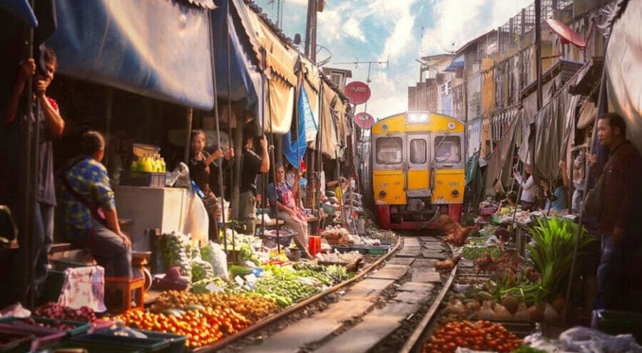 Когда поезд с пыхтением проезжает по причудливому рынку, все в спешке сворачивают свои товары и навесы, а затем – выкладывают их обратно, когда поезд уходит. Это происходит несколько раз в день!