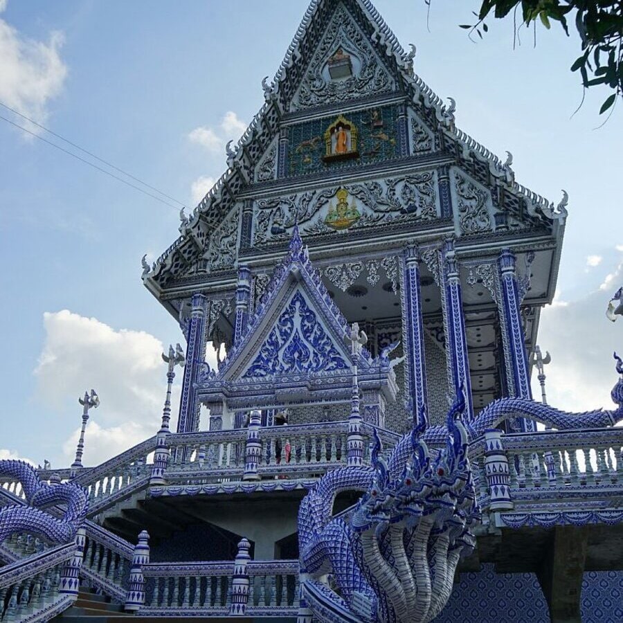 Еще один необычный буддистский храм, который тайцы называют Фарфоровым. Внутри него стены расписаны перламутровыми красками, этот оттенок получают из перемолотых раковин моллюсков, которые водятся в этой бухте.