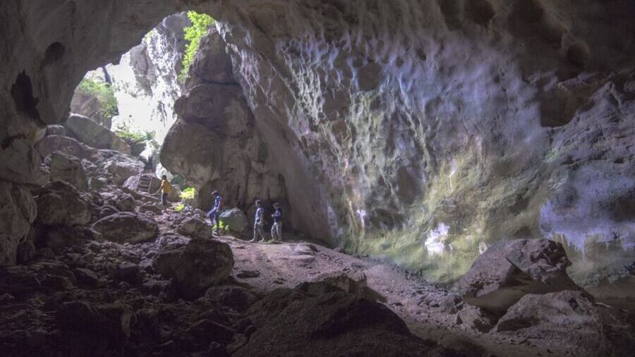 Спускаемся вглубь в сапогах и с фонариками, исследуем карстовые пещеры.