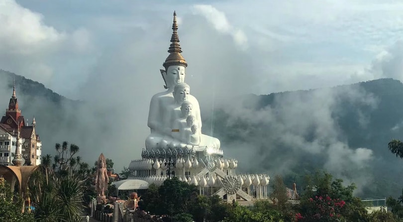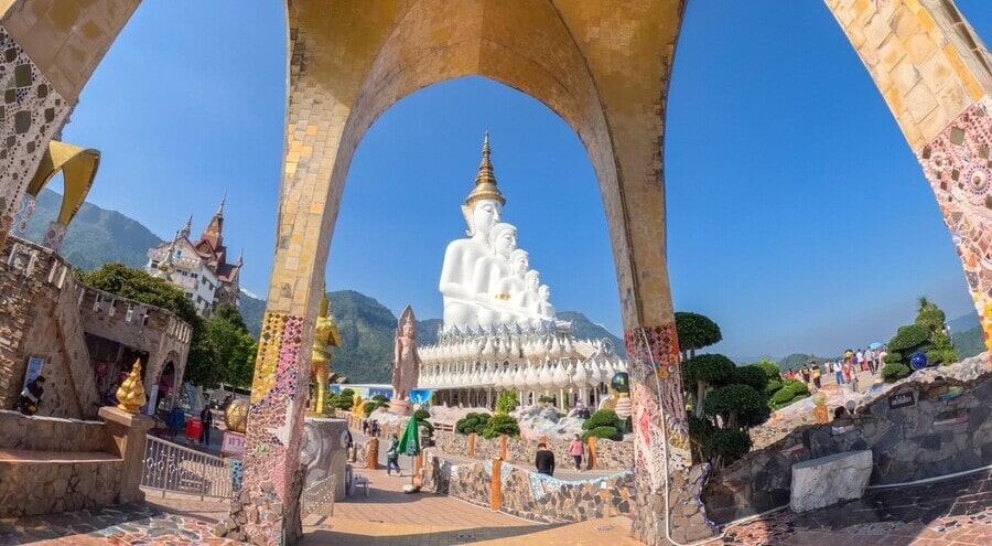 Храм на стеклянной горе Wat Pha Sorn Kaew. Многие полагают, что он самый прекрасный в Таиланде. Особенно, учитывая шикарные панорамы на горы с лежащими на вершинах облаками. Основные башни Ват Пра Сорн собраны из более чем 5 млн элементов мозаики. В небольших строениях и садах возле храма располагаются стеклянные беседки для медитаций и уединения.