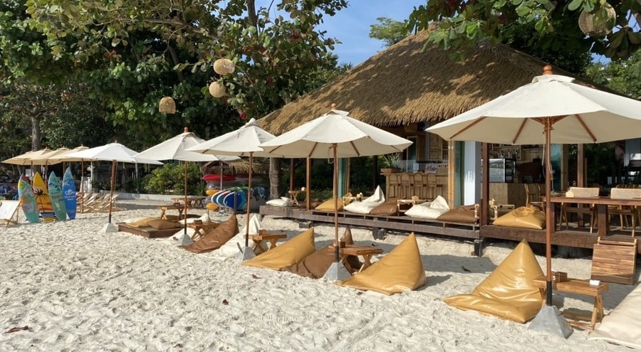 Есть пластиковые лежаки, кафе с широким выбором блюд, в том числе для детей, массаж, прокат мотобайков, магазин, банкомат и обмен валюты, вечерняя дискотека и фаершоу.