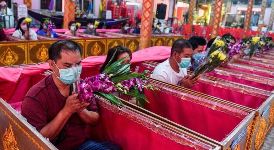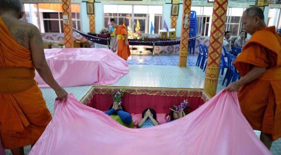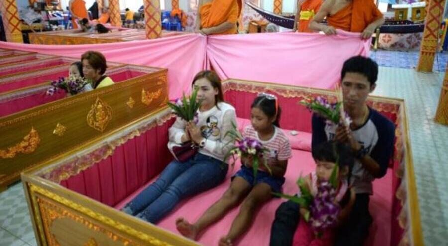 В буддийском храме на окраине Паттайи ежедневно проходят похороны, на которых верующие стремятся избавиться от неудач и привлечь фортуну с помощью церемонии, во время которой они ложатся на некоторое время в накрытый гроб.