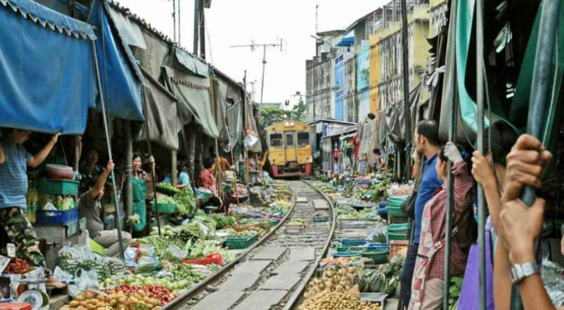 В определенное время, после ударов гонга, поезд проследует по путям, которые проходят прямо через торговые ряды рынка.